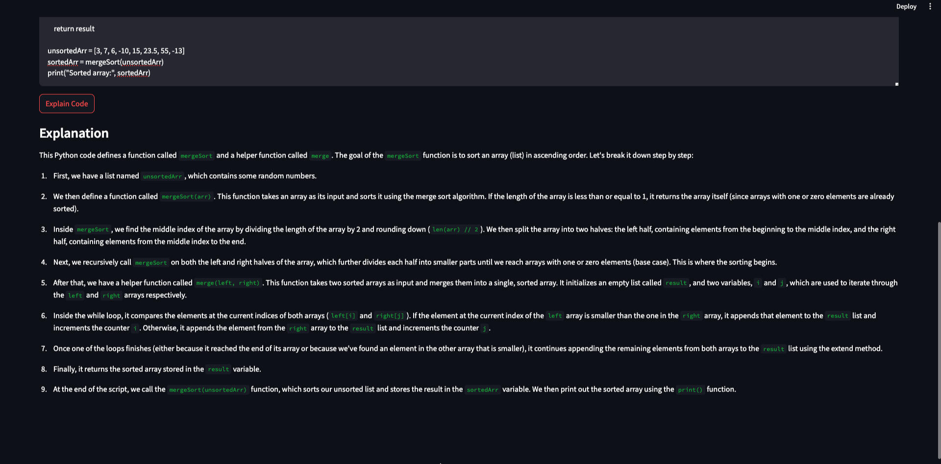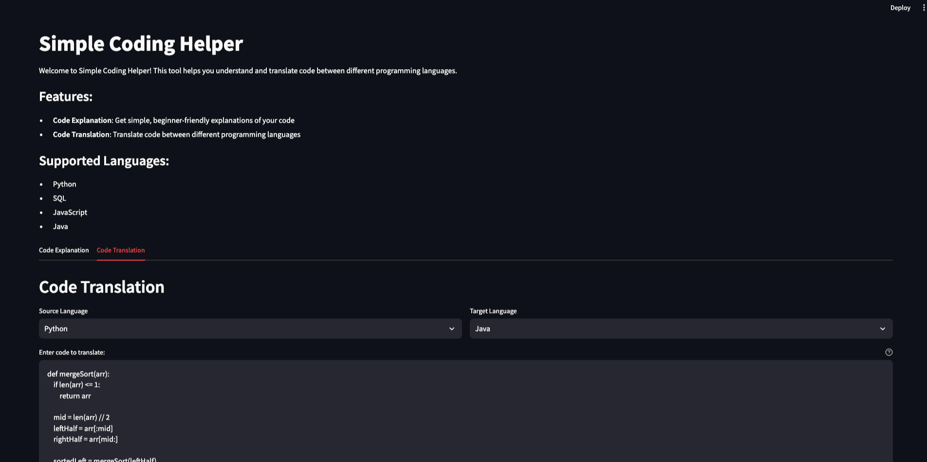 GitHub LinkProject SummarySimple Coding Helper is a lightweight, privacy-focused web application built with Streamlit that helps users explain and translate code across multiple programming languages using a locally hosted Ollama model. Designed for learners, developers, and educators, the app supports a variety of languages including Python, JavaScript, SQL, Java, C++, HTML, CSS, Ruby, PHP, and Go.Unlike cloud-based tools, Simple Coding Helper runs entirely on your machine, ensuring offline functionality and data privacy. Users can choose between two main modes:Explain Code – Paste a snippet to get a plain-language explanation.Translate Code – Convert code from one programming language to another.The app features a clean, intuitive interface where users can input their code, select languages, and instantly get results powered by the local Ollama LLM.The backend logic is modular, with separate components for language handling, model communication, and UI control. This structure makes it easy to maintain, extend, or integrate with other tools.Ideal for code learners, bootcamp students, and professionals working in secure environments, Simple Coding Helper combines the power of AI with the convenience of local processing.It’s open-source, customizable, and ready to run on any system with Python and Ollama installed.