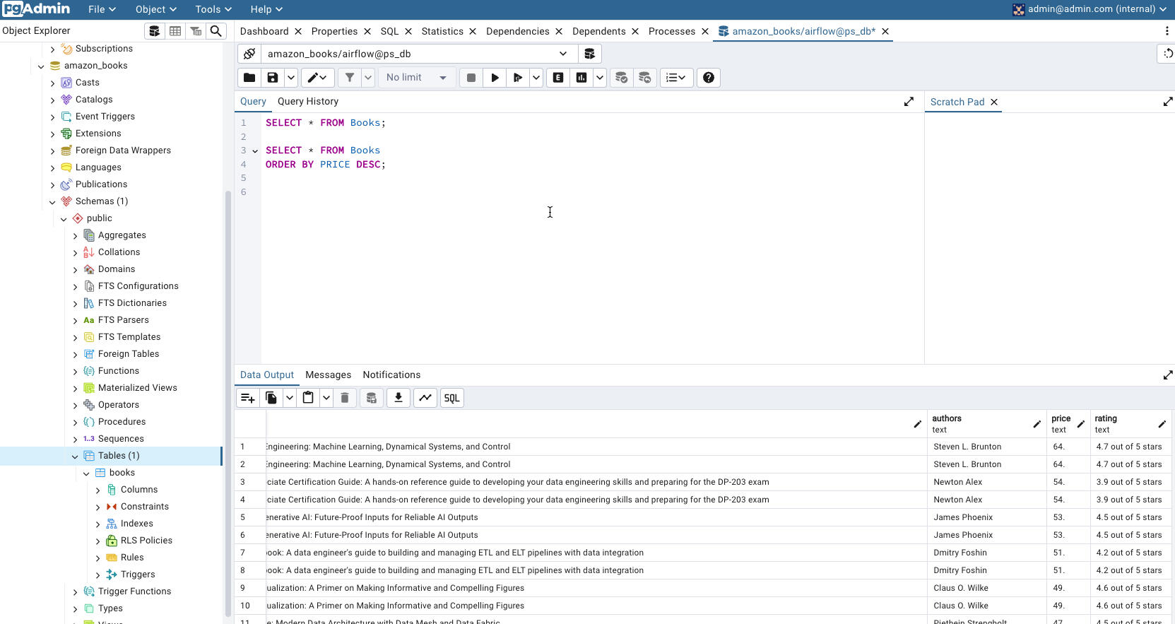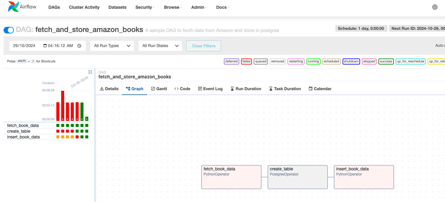 The key steps in my project are:Data Extraction: I'm using API calls to fetch data on Amazon's data engineering books. This represents the "Extract" step of the ETL process.Data Transformation: Once the data is extracted, I'm using SQL to clean the data by removing any trailing data and converting the data types to the appropriate format. This is the "Transform" step.Data Loading: The transformed data is then loaded into a PostgreSQL database, which represents the "Load" step.Orchestration with Apache Airflow: I'm using Apache Airflow to orchestrate the entire ETL process, allowing me to schedule, monitor, and manage the data pipeline.Docker Containerization: To ensure consistency and ease of deployment, I'm running the entire project within a Docker container.This comprehensive ETL solution allows me to regularly and reliably fetch data from the Amazon API, transform it, and load it into a PostgreSQL database for further analysis or reporting.FeaturesFetches data on data engineering books from the Amazon API.