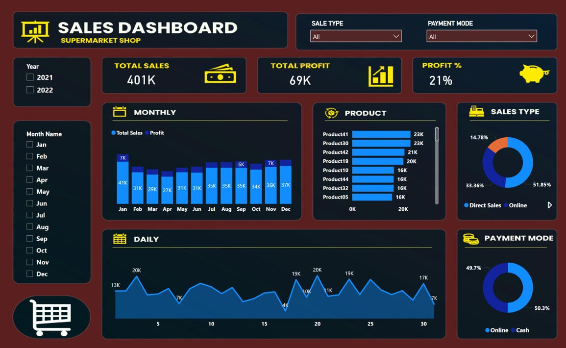5. How does profit percentage relate to total sales?Here are my takeaways:1. Monthly and daily sales trends show significant variation. January has the highest monthly sales at 41K, while March and April have the lowest at around 27K-29K. Daily sales fluctuate between 4K and 20K, with several peaks throughout the month.2. The top-selling products are Product41 and Product30, both generating 23K in sales. They're followed by Product42 (21K) and Product19 (20K). Other products like Product10, Product44, Product32, and Product05 all contribute 16K each to total sales.3. Sales channels show a clear preference for direct sales, accounting for 51.85% of total sales. Online sales make up 33.36% of the total, with the remaining portion likely attributed to other channels not specified in the image.4. Payment modes are fairly evenly split, with a slight preference for cash transactions. Cash payments account for 50.3% of sales, while online payments make up 49.7%. This balanced distribution suggests customers are comfortable with both payment methods.5. The overall profit percentage stands at 21%, with total sales of 401K resulting in a total profit of 69K. This indicates a healthy profit margin for the supermarket, though it's important to note that this percentage remains constant despite variations in monthly sales figures.
