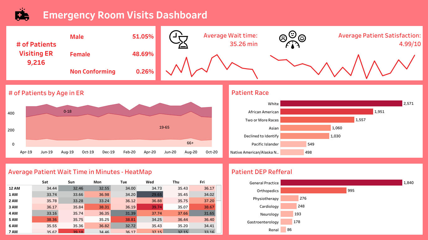 5. Which medical departments receive the most patient referrals from the ER, and what might this suggest about common health issues?Here are my takeaways:1. The gender distribution shows 51.05% male patients, 48.69% female patients, and 0.26% non-conforming patients. There's a slight majority of male patients, with a small but notable percentage identifying as non-conforming.2. The average wait time is 35.26 minutes, while the average patient satisfaction score is 4.99/10. This relatively low satisfaction score might be influenced by the wait time, though other factors are likely involved given the complexity of ER experiences.3. The 19-65 age group consistently accounts for the majority of ER visits from April 2019 to October 2020. The 0-18 age group is the second largest, followed by the 66+ group. The pattern appears relatively stable over time, with some minor fluctuations.4. The top three racial demographics are White (2,571 patients), African American (1,951 patients), and Two or More Races (1,557 patients). While White patients form the largest group, there's significant representation from other racial categories, indicating a diverse patient population.5. General Practice receives the most referrals (1,840), followed by Orthopedics (995) and Physiotherapy (276). This suggests that many ER visits may be for non-emergency issues that could be handled by general practitioners, while musculoskeletal problems (addressed by orthopedics and physiotherapy) are also common reasons for ER visits.