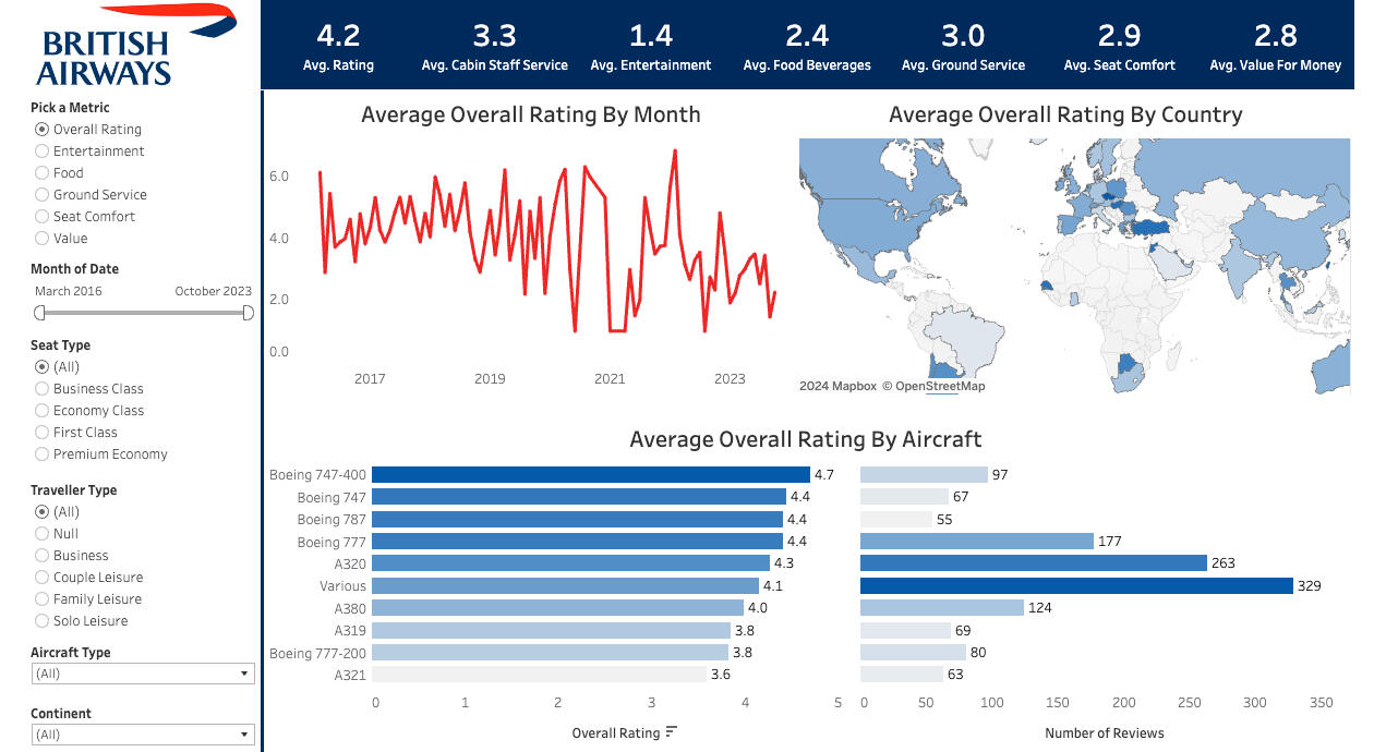 5. How do the newer aircraft models (e.g., Boeing 787) compare in ratings to older models (e.g., Boeing 747-400)?Here are my takeaways:1. Cabin Staff Service is the highest-rated aspect at 3.3, significantly outperforming Entertainment, which scores lowest at 1.4. This suggests comparatively better service but a need to improve onboard entertainment options since it is rated out of 10.2. The overall rating trend shows high volatility from 2017 to 2023, with notable dips around 2021 and 2023. This could reflect service disruptions, possibly related to the global pandemic and its aftermath.3. The Boeing 747-400 receives the highest rating (4.7) despite having fewer reviews (97) than some other aircraft. This indicates that quantity of reviews doesn't necessarily correlate with higher ratings.4. The map suggests varying customer satisfaction across different countries, with some European and African nations showing darker blue (potentially higher ratings). However, the limited visible data makes it difficult to draw definitive conclusions about geographical trends.5. Newer aircraft like the Boeing 787 (4.4) rate well, but interestingly, the older Boeing 747-400 (4.7) outperforms it. This suggests that age of aircraft model alone doesn't determine customer satisfaction.