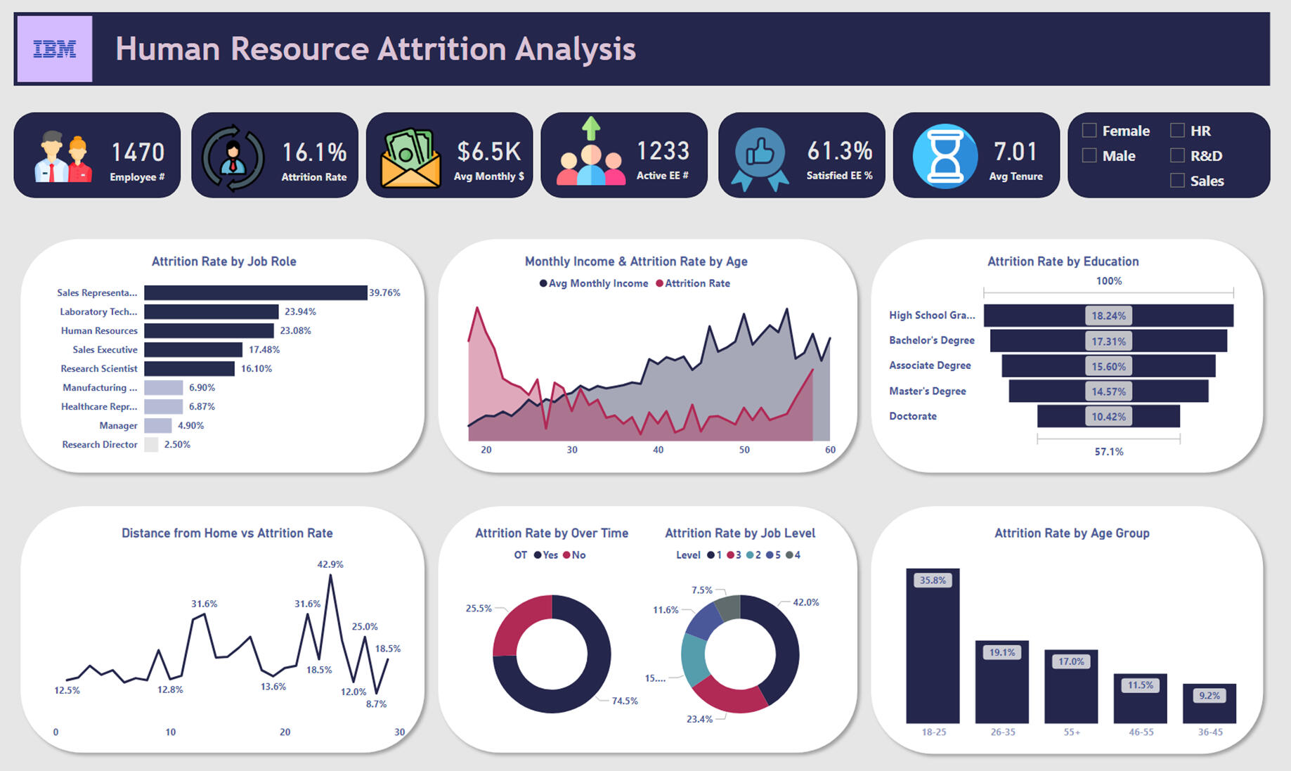 5. How does distance from home impact retention?Here are my takeaways:1. Sales positions show the highest turnover at nearly 40%, likely due to high-pressure environments, commission-based pay structures, and competitive market conditions. The data suggests a need to reevaluate the sales department's work culture, compensation packages, and career development opportunities. Regular check-ins and improved support systems could help reduce this rate.2. Education shows a clear inverse relationship with attrition - from 18.24% for high school graduates to 10.42% for doctorate holders. This pattern suggests that higher education leads to more specialized roles, better job satisfaction, clearer career paths, and possibly better compensation packages. Investment in employee education could be a retention strategy.3. The 18-25 age group's high attrition (35.8%) reflects a broader trend of job-hopping among younger professionals. This generation prioritizes rapid career growth, work-life balance, and diverse experiences. Companies need stronger early-career development programs, mentorship opportunities, and clear advancement paths to retain young talent.4. The disconnect between high satisfaction (61.3%) and high attrition (16.1%) indicates that satisfaction alone doesn't ensure retention. External factors such as competitive job offers, career growth opportunities, work-life balance, and market conditions play crucial roles. This suggests the need for a more comprehensive retention strategy beyond job satisfaction.5. The distance-attrition relationship shows significant spikes (up to 42.9%) at certain distances, suggesting commute time significantly impacts retention. This data supports the case for hybrid work models, relocation assistance, or satellite office locations. Companies should consider flexible work arrangements to accommodate employees with challenging commutes.