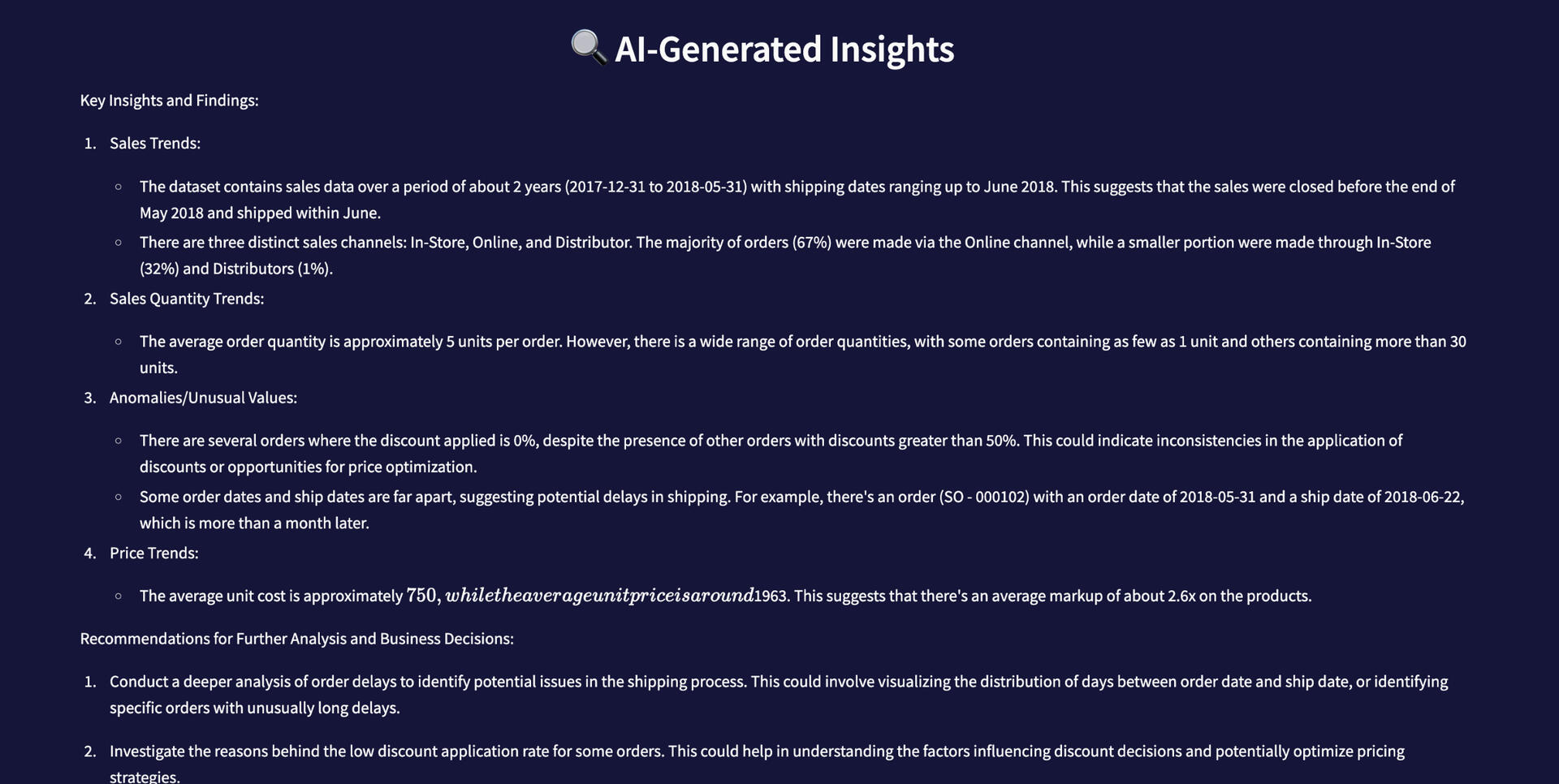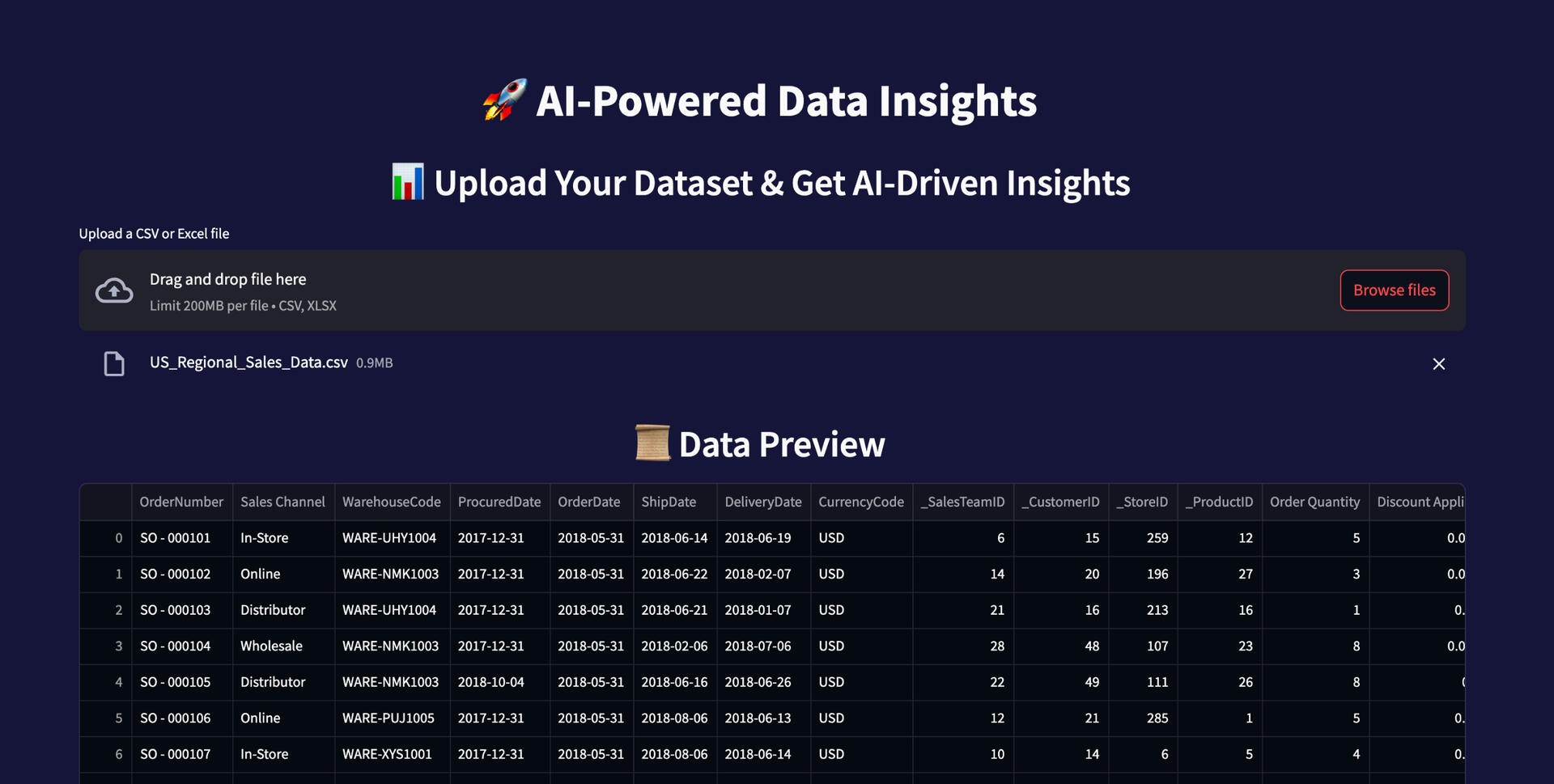 GitHub LinkThe LLM Powered Data Insights project is a cutting-edge tool designed to streamline data analysis and insight generation using the power of artificial intelligence. This application allows users to upload CSV or Excel datasets, which are then automatically cleaned, preprocessed, and analyzed. By leveraging LangChain’s Ollama model, the system intelligently identifies key trends, anomalies, and patterns within the data, offering users data-driven recommendations for better decision-making.A key feature of this project is its automated data preprocessing. It removes duplicates, fills missing values with appropriate replacements (such as median for numerical data and “Unknown” for categorical data), and correctly formats boolean, datetime, categorical, and numerical columns. This ensures that the dataset is clean, consistent, and ready for AI analysis.The AI then generates detailed insights by analyzing time-series patterns, numerical distributions, and categorical trends. It highlights important KPIs, detects outliers, and suggests potential actions for better business or research outcomes. Unlike traditional analytics tools that require manual effort, this project delivers instant insights without complex coding or statistical knowledge.The application is built using Streamlit, offering an intuitive, modern UI with a sleek purple-themed design. Users can preview the first 10 rows of their cleaned dataset and receive structured AI-generated insights in real time. Additionally, the project is designed to be lightweight and easily deployable, with an option to host it on Streamlit Cloud for web-based access.Ideal for business analysts, researchers, and data enthusiasts, this project removes the technical barriers of data analysis while enhancing efficiency and accuracy. With future expansions planned, including AI-driven visualizations and automated column labeling, this project is a significant step toward simplifying AI-powered data exploration. 🚀