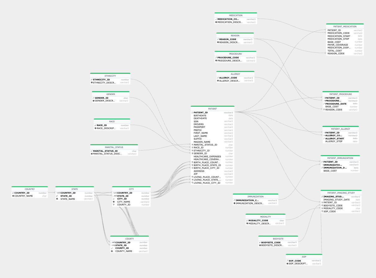 Each patient in the PATIENT table is associated with entries in these tables through their respective IDs.2. COUNTRY, STATE, CITY, and COUNTY: