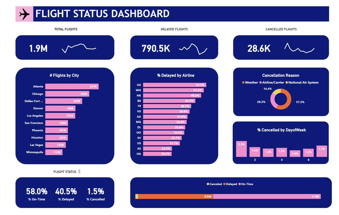 5. What is the overall breakdown of on-time, delayed, and cancelled flights?Here are my takeaways:1. The cities with the highest flight volume are Atlanta (347K flights), Chicago (286K flights), and Dallas-Fort Worth (240K flights). These major hubs handle a significant portion of air traffic.2. United Airlines leads in flight delays at 53.3%, followed closely by Southwest at 51.4%. Spirit, JetBlue, and Frontier also show high delay percentages, ranging from 40.7% to 48.2%.3. Flight cancellations are primarily due to Weather issues (57.3%) and Airline/carrier (28.3%). National Air System-related reasons account for 14.4% of cancellations.4. Sunday appears to have the highest percentage of flight cancellations at 2.3%, with Saturday following at 1.7%. Other days of the week show lower cancellation rates.5. Overall, 58% of flights are on time, while 40.5% experience delays. Only 1.5% of flights are cancelled. This indicates that while most flights operate as scheduled, delays affect a significant portion of air travel.