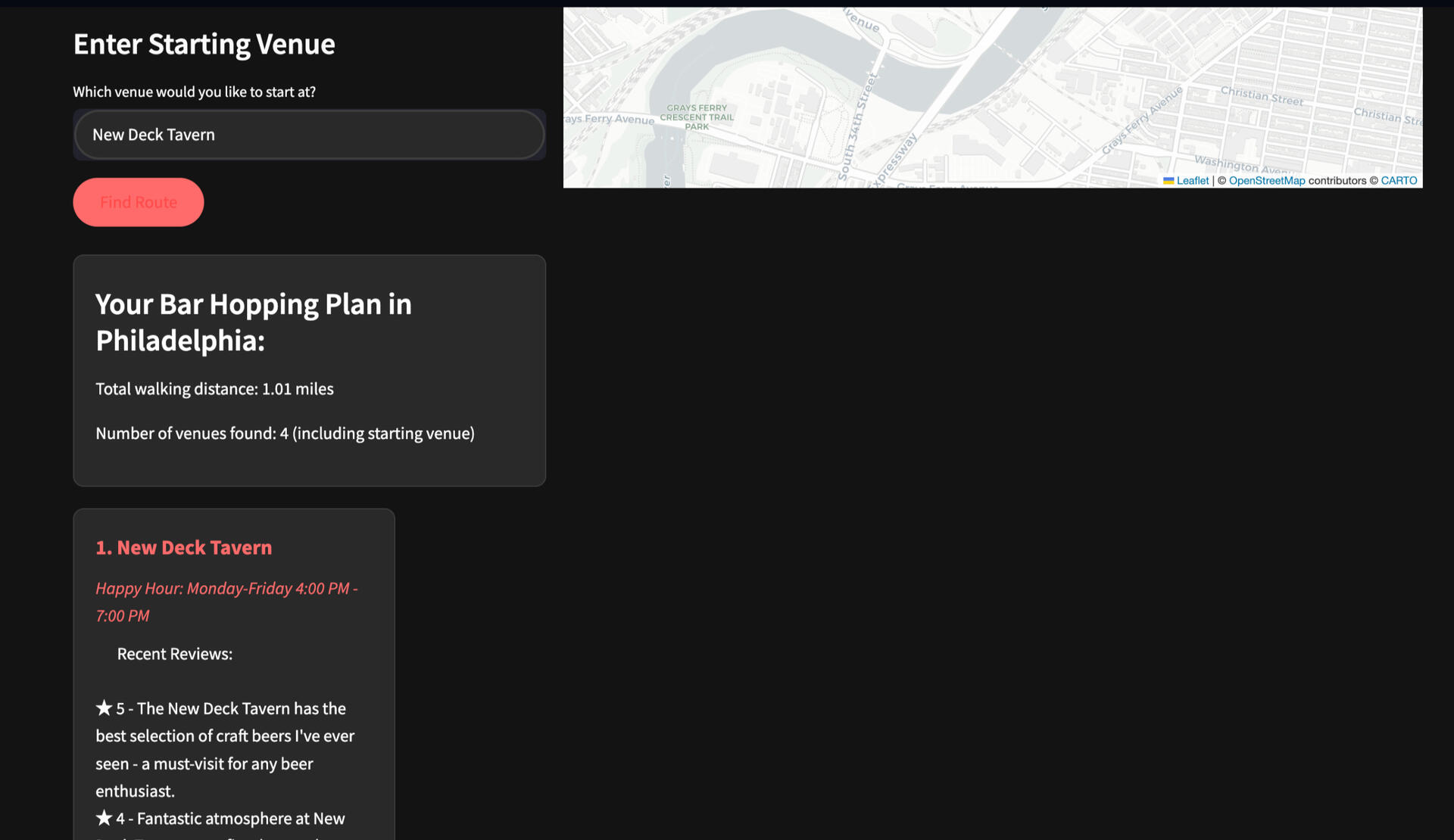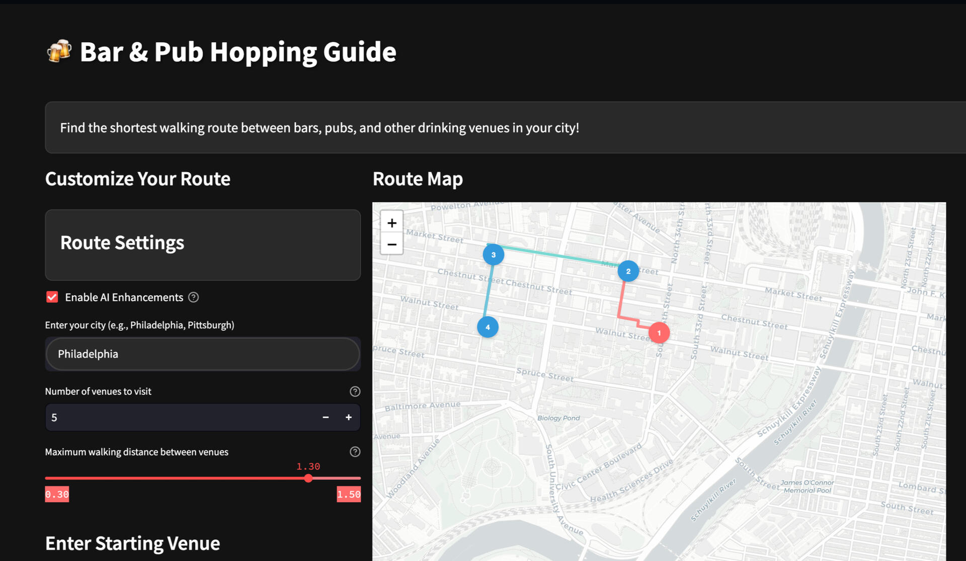 The main function orchestrates the overall application flow in Streamlit. It sets up the user interface, handles user inputs (like city and venue choices), and invokes other functions to perform geocoding, find nearby venues, calculate routes, and display results. This function is where the application starts and manages interactions with the user.These functions are critical for the application’s capability to offer real-time, interactive route planning and mapping for users looking to optimize their bar-hopping experience.