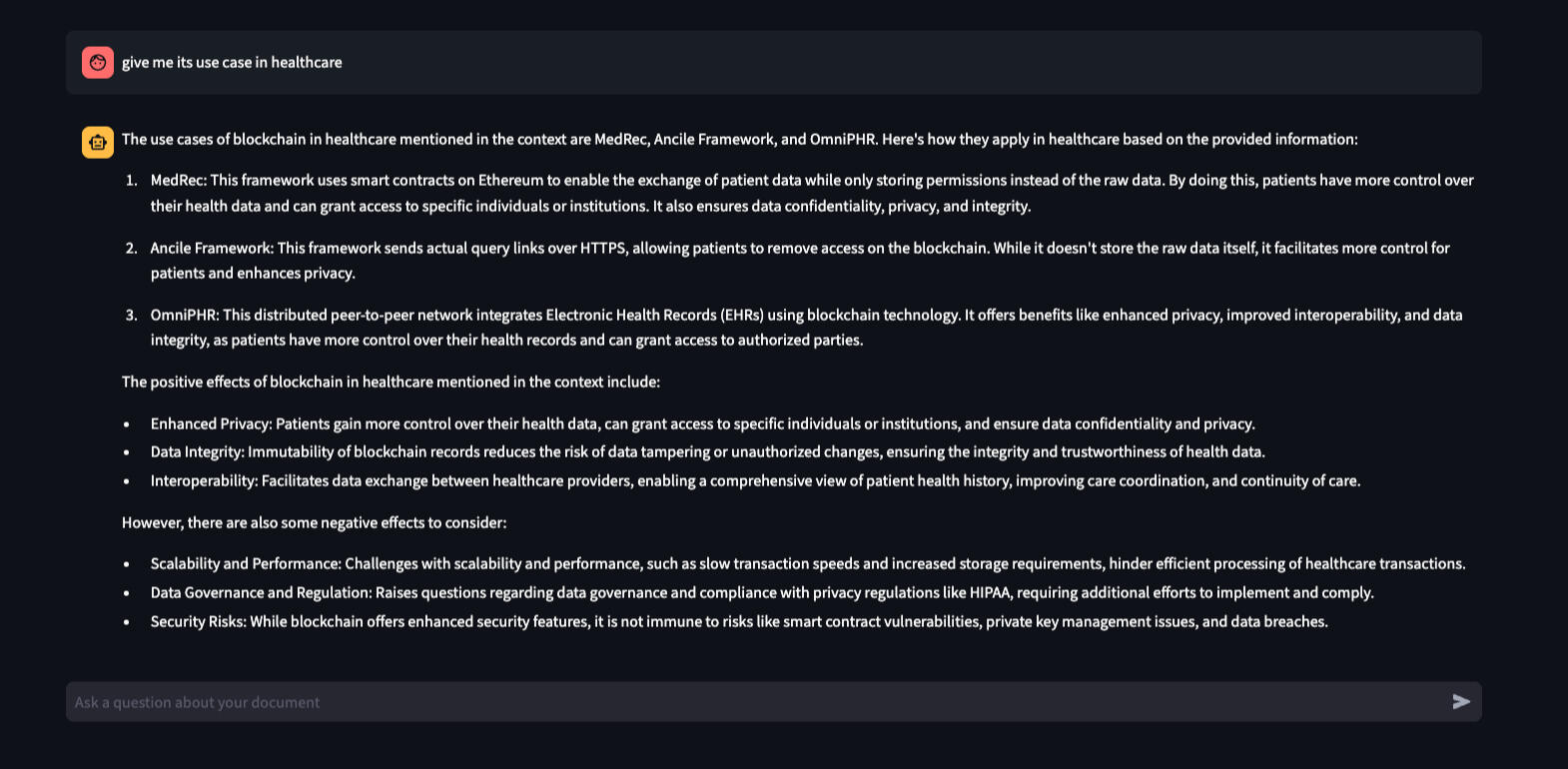 This is a PDF document analysis and question-answering system that combines several modern technologies:1. Frontend: Built with Streamlit, providing a user-friendly web interface