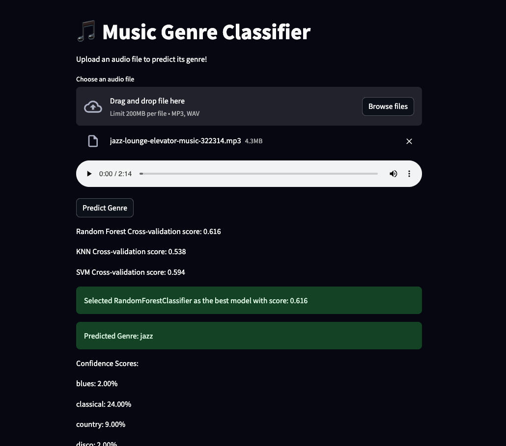 A machine learning application that analyzes audio files to classify music genres. Using advanced audio feature extraction and multiple ML models, it provides real-time genre predictions through an intuitive Streamlit interface.